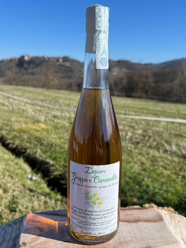 La nostra camomilla, rigorosamente raccolta a mano, si reinventa incontrando una finissima grappa di Nebbiolo per dare vita ad oro puro! Perfetta a temperatura ambiente, diventa intrigante se servita fredda da frigo o con un cubetto di ghiaccio. Digestiva ma al tempo stesso dissetante, lascia in bocca un piacevole gusto floreale. Bottiglia da 700ml.